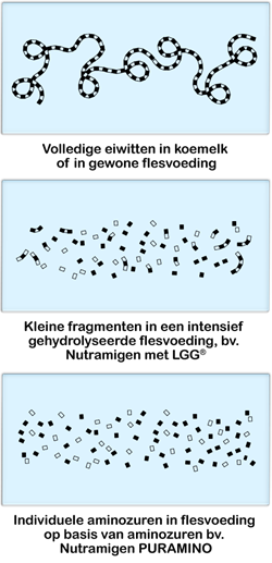 Sommige flesvoedingen voor zuigelingen en opvolg-flesvoedingen zijn gedeeltelijk gehydrolyseerd. Zelfs al zijn de koemelkeiwitketens in deze flesvoedingen gedeeltelijk afgebroken (of gehydrolyseerd), ze zijn nog steeds groot genoeg om allergische reacties te veroorzaken bij baby’s met koemelkallergie. Als gevolg daarvan zijn ze niet hypoallergeen en zijn dus niet geschikt voor zuigelingen met koemelkallergie.